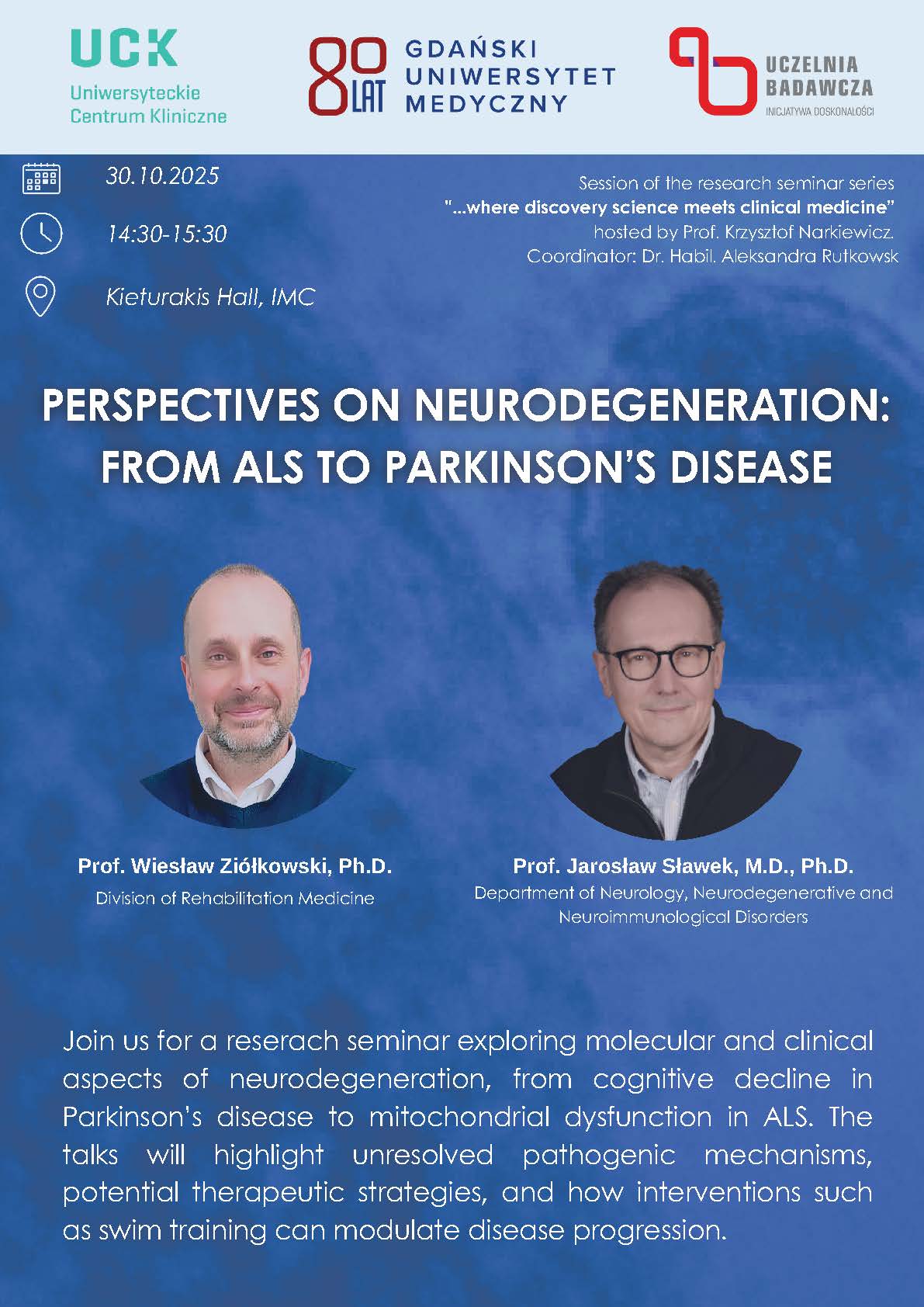 The seminar will focus on the molecular and clinical aspects of neurodegeneration – from cognitive decline in Parkinson’s disease to mitochondrial dysfunction in ALS. The lectures will address unresolved pathogenic mechanisms, potential therapeutic strategies, and the impact of interventions such as swim training on disease progression.