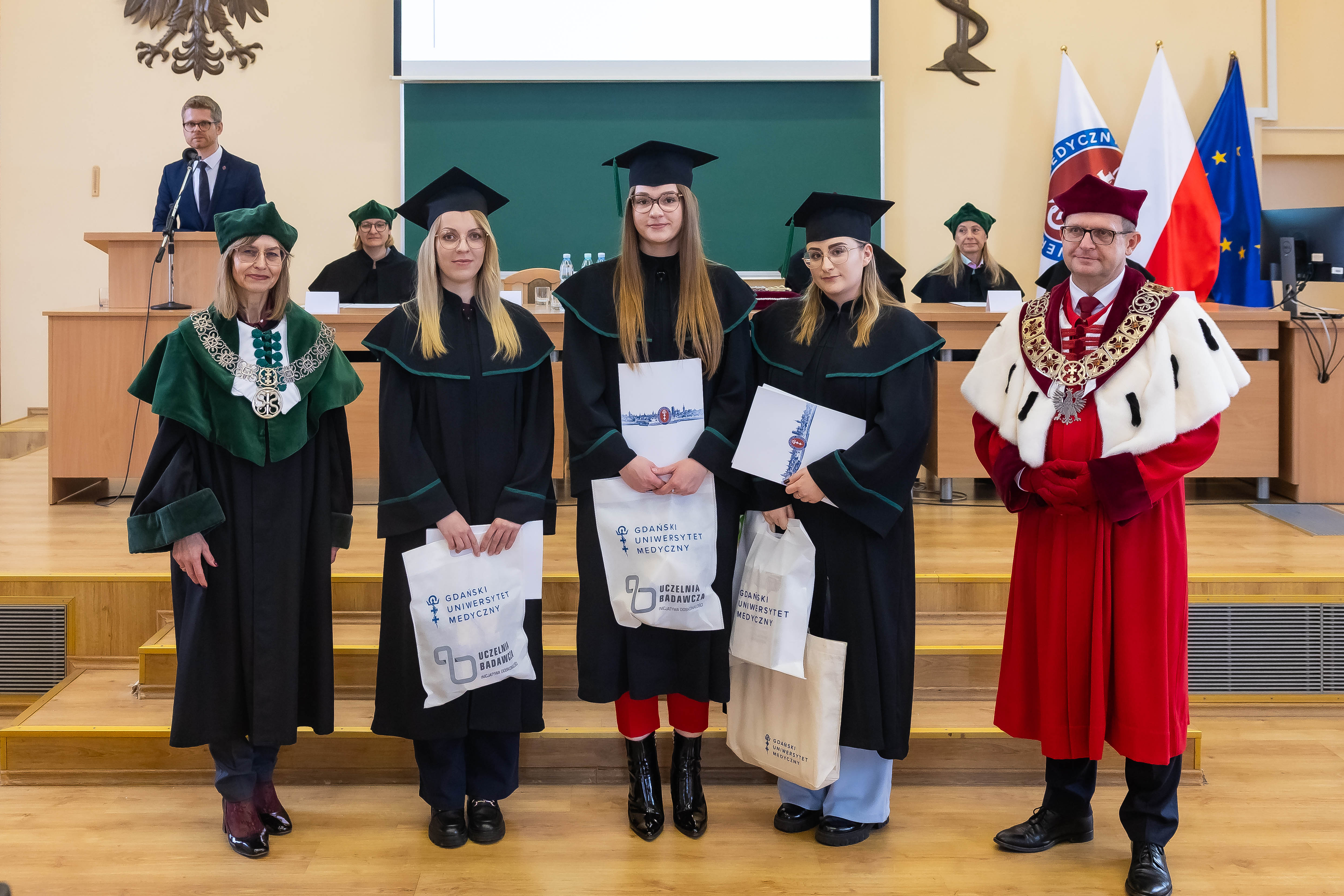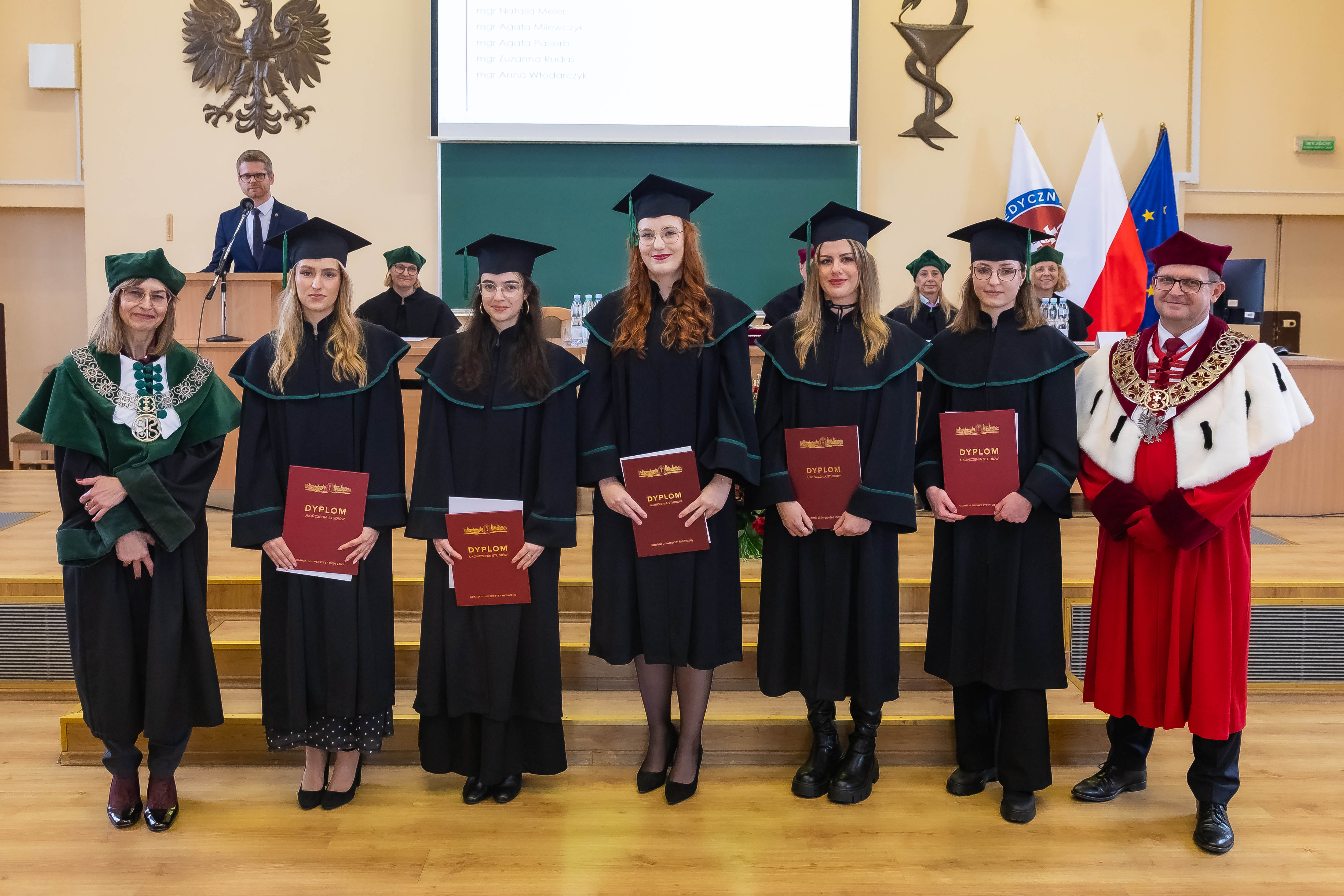 W uroczystości, której przewodniczyła dziekan WF prof. Magdalena Prokopowicz uczestniczyli: rektor prof. Michał Markuszewski, prodziekan Wydziału Lekarskiego dr hab. Jarosław Jendrzejewski, prodziekan ds. studenckich Wydziału Chemicznego Politechniki Gdańskiej dr hab. inż. Sebastian Demkowicz, prof. uczelni, prodziekani Wydziału Farmaceutycznego: dr hab. Agnieszka Ćwiklińska, prof. Katarzyna Gobis, dr hab. Danuta Siluk, prof. uczelni, członkowie Rady Wydziału, członkowie Rady Pracodawców, zaproszeni goście oraz rodziny absolwentów.
