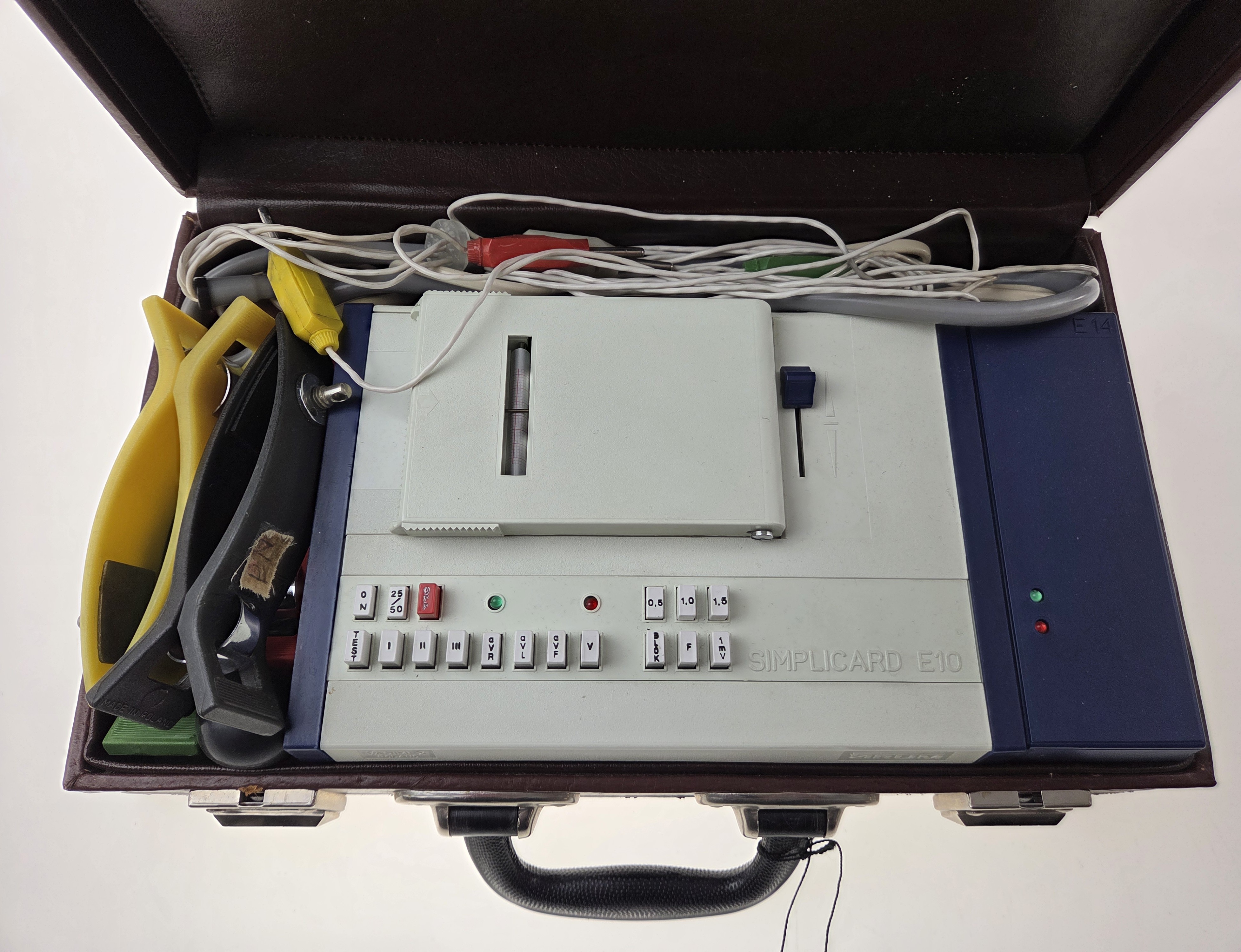 Nie muszę przytaczać odpowiedzi na to pytanie. Jeszcze jeden pakunek wylądował w bagażniku samochodu. Z powodu pośpiechu i odrobiny zamieszania, nie obejrzałem skarbu, który tak niespodziewanie znalazł się w moich rękach. Po powrocie, w Gdańsku, nastąpiło rozpakowanie pozyskanych obiektów. Jednym z nich była solidna skórzana walizeczka, o wymiarach 36x21x10 cm, nie była też lekka. Zawierała jednokanałowy aparat EKG, SIMPLICARD E-10. Właśnie waga aparatu wzbudziła pewne wątpliwości. Wyniesienie w kosmos każdego kilograma towaru wymaga ogromnej energii i znacznych nakładów finansowych. Przygotowując ten tekst dowiedziałem się, że w 1985 wyniesienie 1 kg za pomocą wahadłowca kosztowało ok. 70 tys. dolarów, współcześnie podobna operacja przeprowadzona poprzez rakietę Falcon Heavy to ok. 2-3 tys. dolarów. Mniej, lecz wciąż bardzo drogo. Dlatego inżynierowie pracują nad zmniejszeniem wymiarów wszystkiego co powinno znaleźć się w ładowni rakiety.