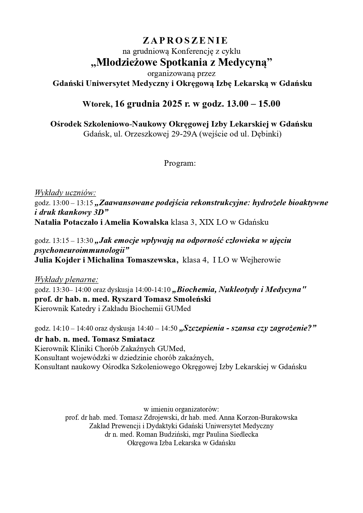 Zapraszamy na grudniową konferencję z cyklu Młodzieżowe Spotkania z Medycyną, którą Gdański Uniwersytet Medyczny organizuje wspólnie z Okręgową Izbą Lekarską w Gdańsku. Wydarzenie odbędzie się we wtorek, 16 grudnia 2025 r., w godz. 13:00–15:00, w formule hybrydowej.