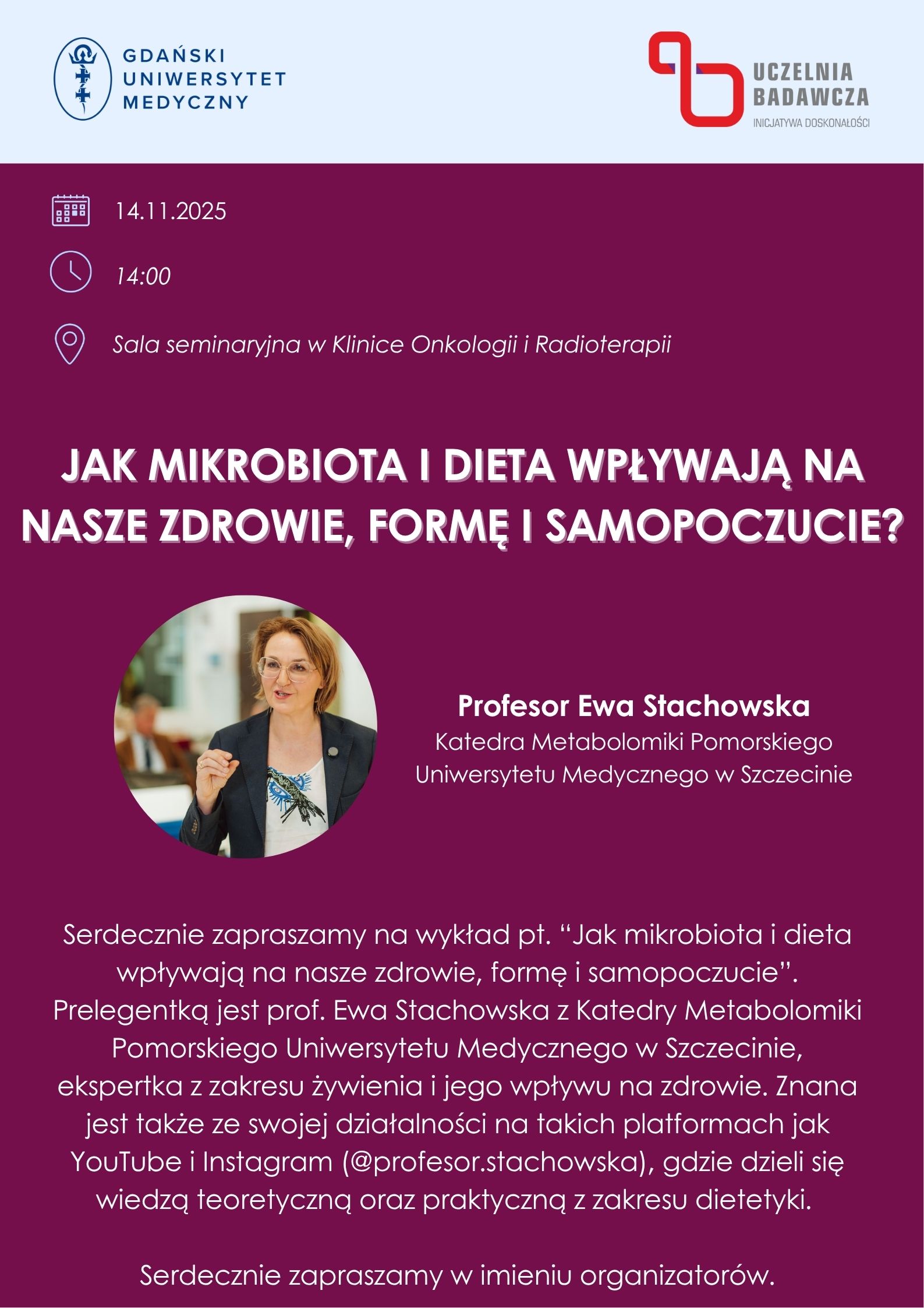 Zapraszamy na seminarium prof. Ewy Stachowskiej z Katedry Metabolomiki Pomorskiego Uniwersytetu Medycznego w Szczecinie Jak mikrobiota i dieta wpływają na nasze zdrowie, formę i samopoczucie. Spotkanie odbędzie się w sali seminaryjnej w Klinice Onkologii i Radioterapii 14 listopada o 14.