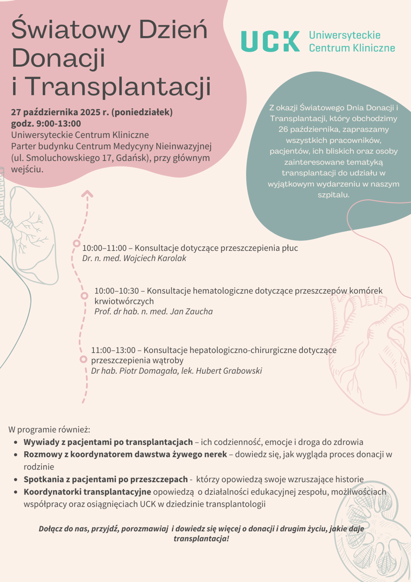 Z okazji Światowego Dnia Donacji i Transplantacji zapraszamy do Uniwersyteckiego Centrum Klinicznego na bezpłatne konsultacje z transplantologami, rozmowy z koordynatorami transplantacyjnymi, a także z osobami po przeszczepieniu. Wydarzenie odbędzie się 27 października w godz. 9.00-13.00 na parterze budynku Centrum Medycyny Nieinwazyjnej.