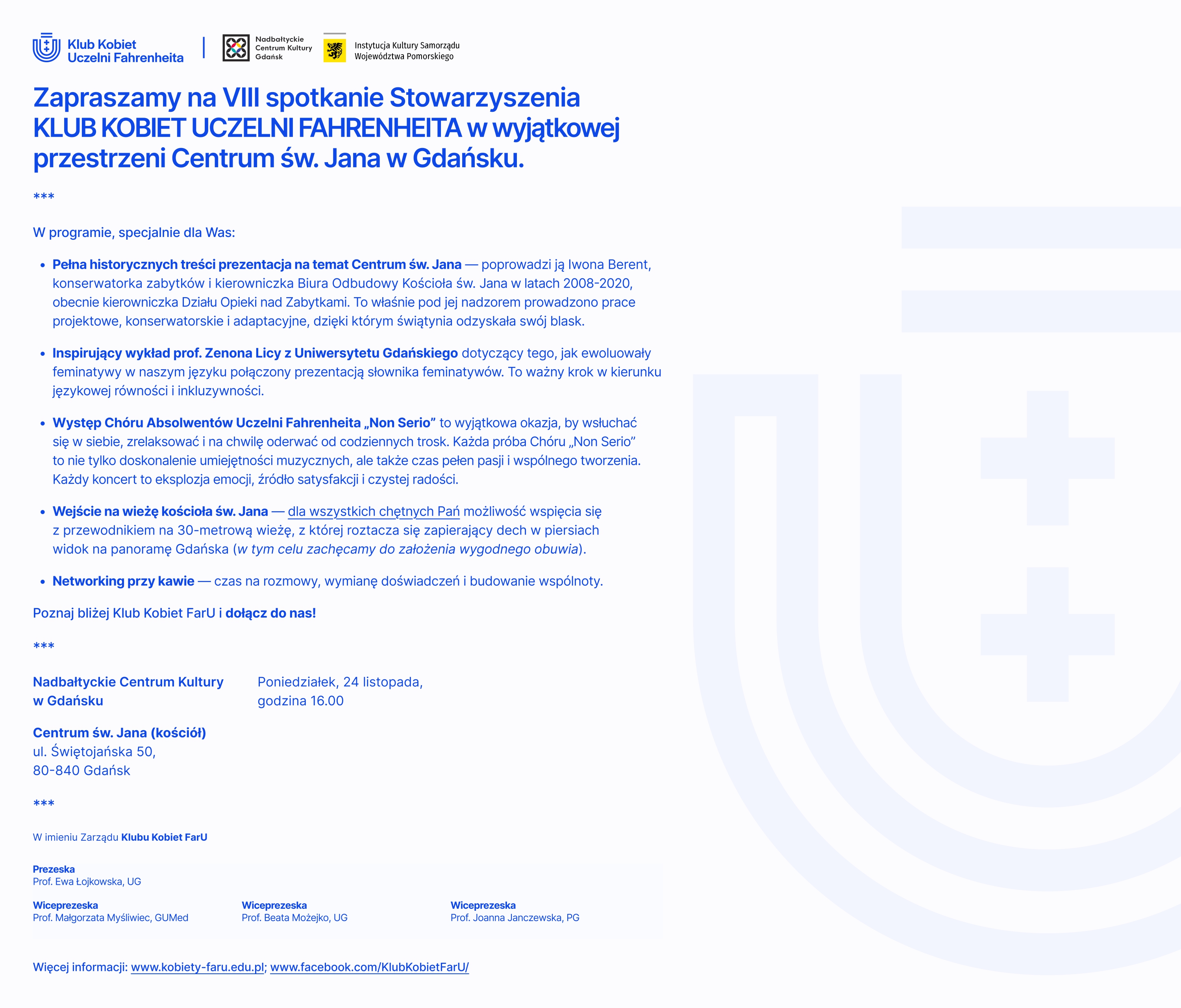 Zapraszamy na VIII spotkanie Stowarzyszenia Klubu Kobiet Uczelni Fahrenheita, które odbędzie się w niezwykłej przestrzeni Centrum św. Jana w Gdańsku.