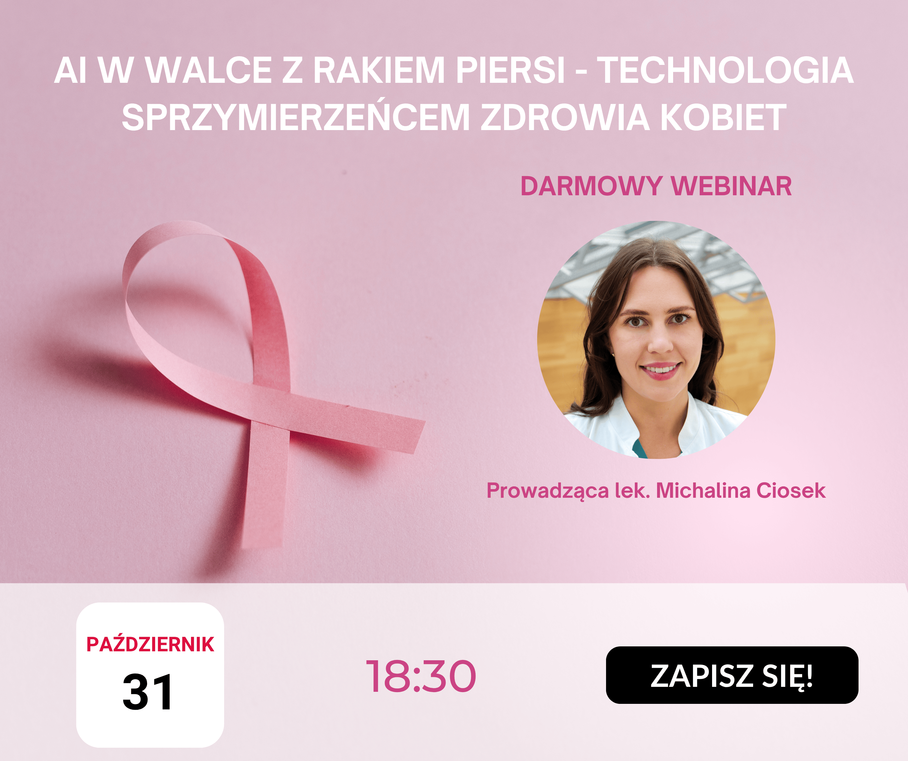 Październik to Miesiąc Świadomości Raka Piersi. Z tej okazji zapraszamy na wyjątkowy webinar: AI w walce z rakiem piersi – technologia sprzymierzeńcem zdrowia kobiet, podczas którego dowiecie się, jak sztuczna inteligencja wspiera lekarzy w diagnozowaniu, analizie obrazów i personalizacji leczenia.